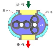泵腔內(nèi)一對8字形轉(zhuǎn)子的不斷反向旋轉(zhuǎn),被抽氣體從進氣口吸入到轉(zhuǎn)子與泵殼之間的空間v0內(nèi),再經(jīng)排氣口排出。由于吸氣后v0空間是全封閉狀態(tài),所以,在泵腔內(nèi)氣體沒有壓縮和膨脹。但當轉(zhuǎn)子頂部轉(zhuǎn)過排氣口邊緣,v0空間與排氣側(cè)相通時,由于排氣側(cè)氣體壓強較高,則有一部分氣體返沖到空間v0中去,使氣體壓強突然增高。當轉(zhuǎn)子繼續(xù)轉(zhuǎn)動時,氣體排出泵外。